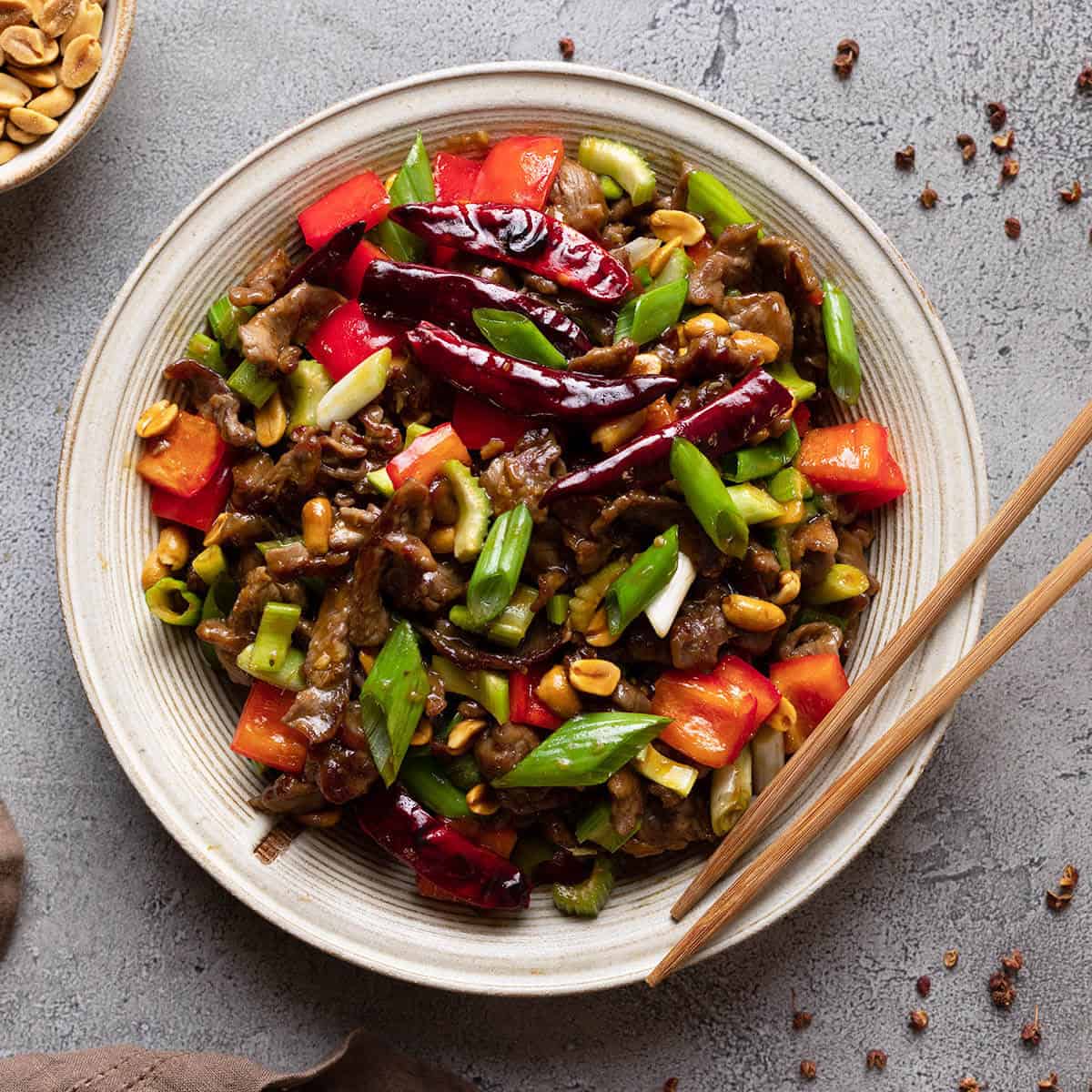 Now back to your wok, add your onion, and then your peanuts, let this sit for a minute or 2, and then the rest of the veggies, with the green onion last, and then your meat, and then your sauce, and mix it in well.