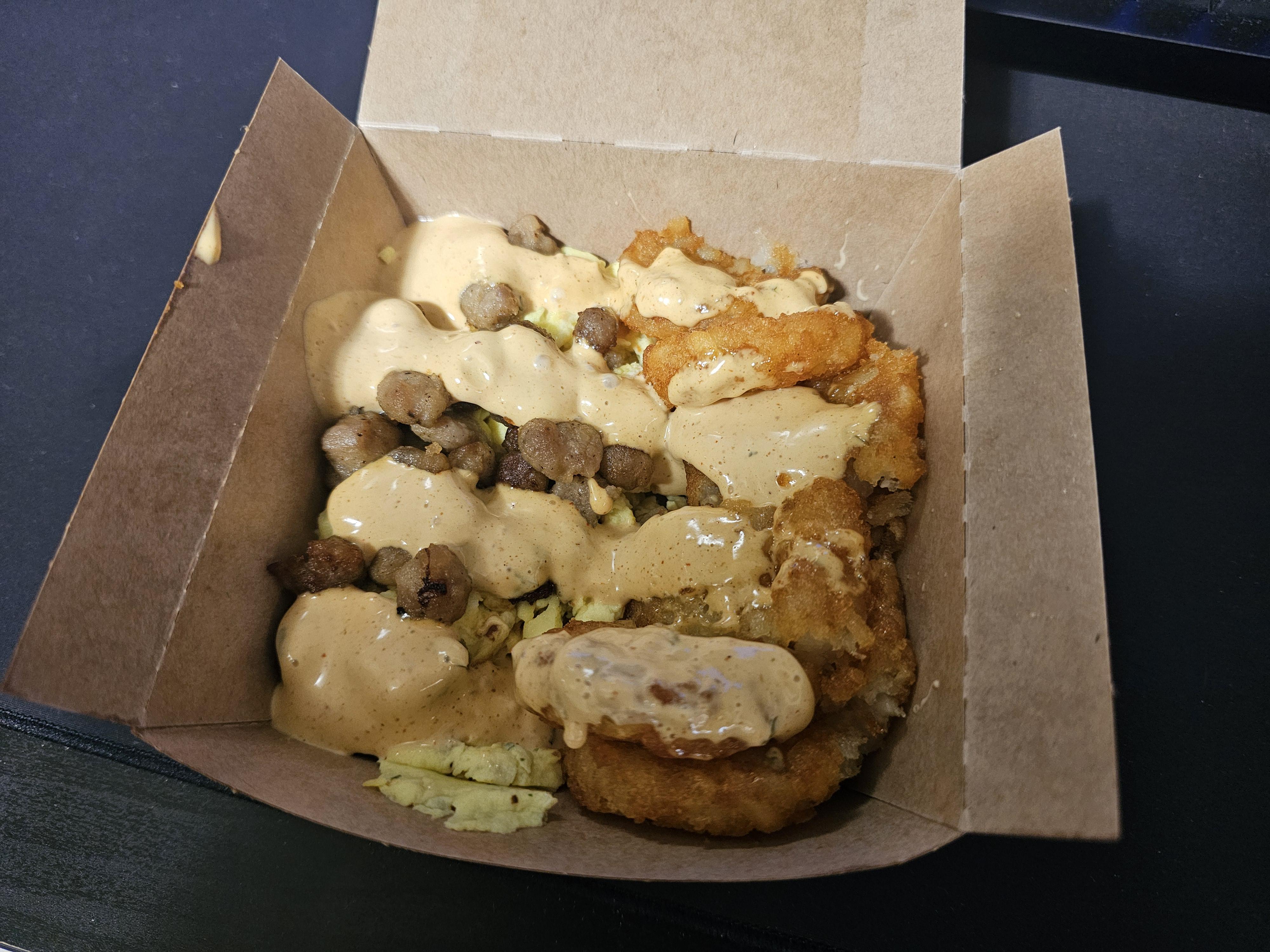 When your done, take your taters, or chopped potatoes, put them in a bowl, then put in a few pieces of pork belly, and then your eggs, spread over some cheese, and then pour some chipolte creama over it, finally some green onion and your good to go!