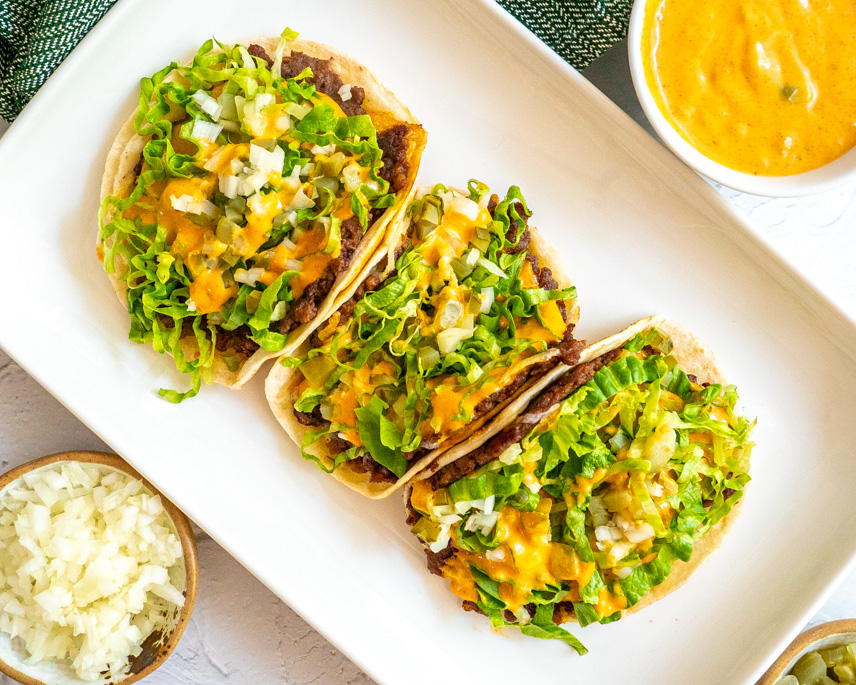 Make some skinny burgers, you do want to fold this into a taco later, so you don’t want a super thick burger patty