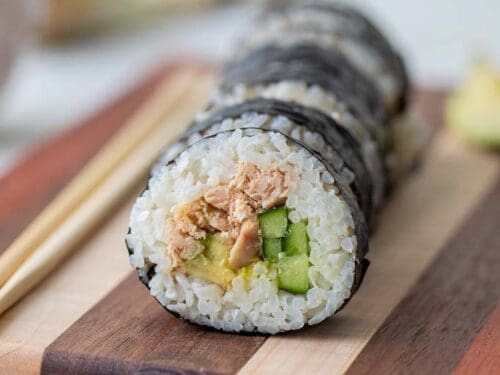 1 TSP Salt 1 TBS Stevia 4 TBS Rice Wine Vinegar 1 TBS Sweet Soy Sauce 2 Cups Of White Rice Half A Carrot Half A Cucumber Wasabi Sauce 1 Can Of Tuna Grated Up Ginger